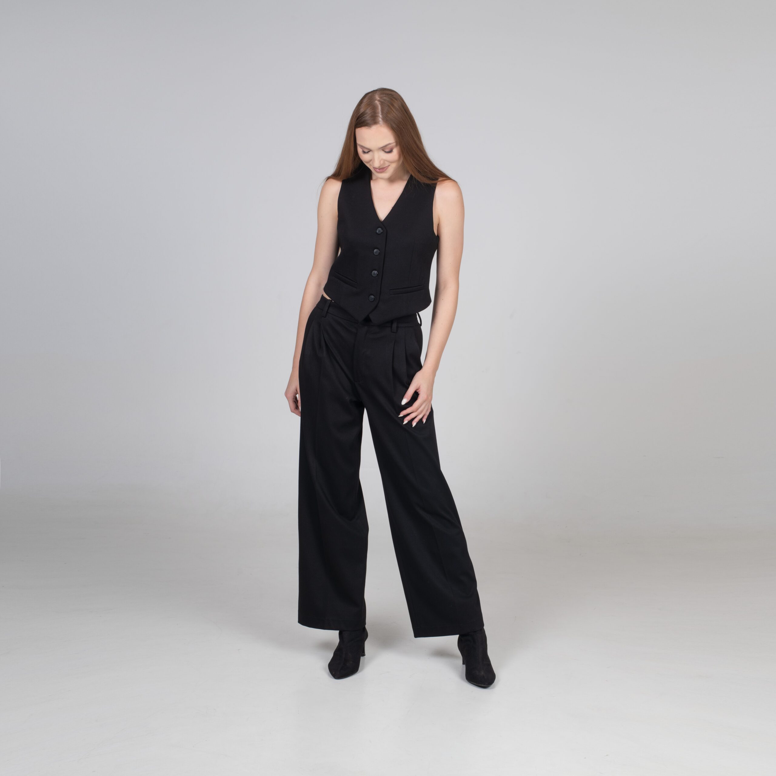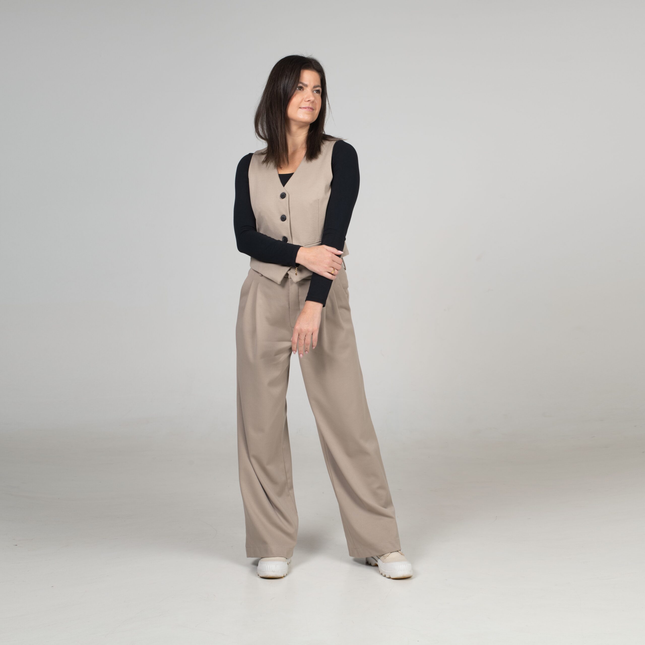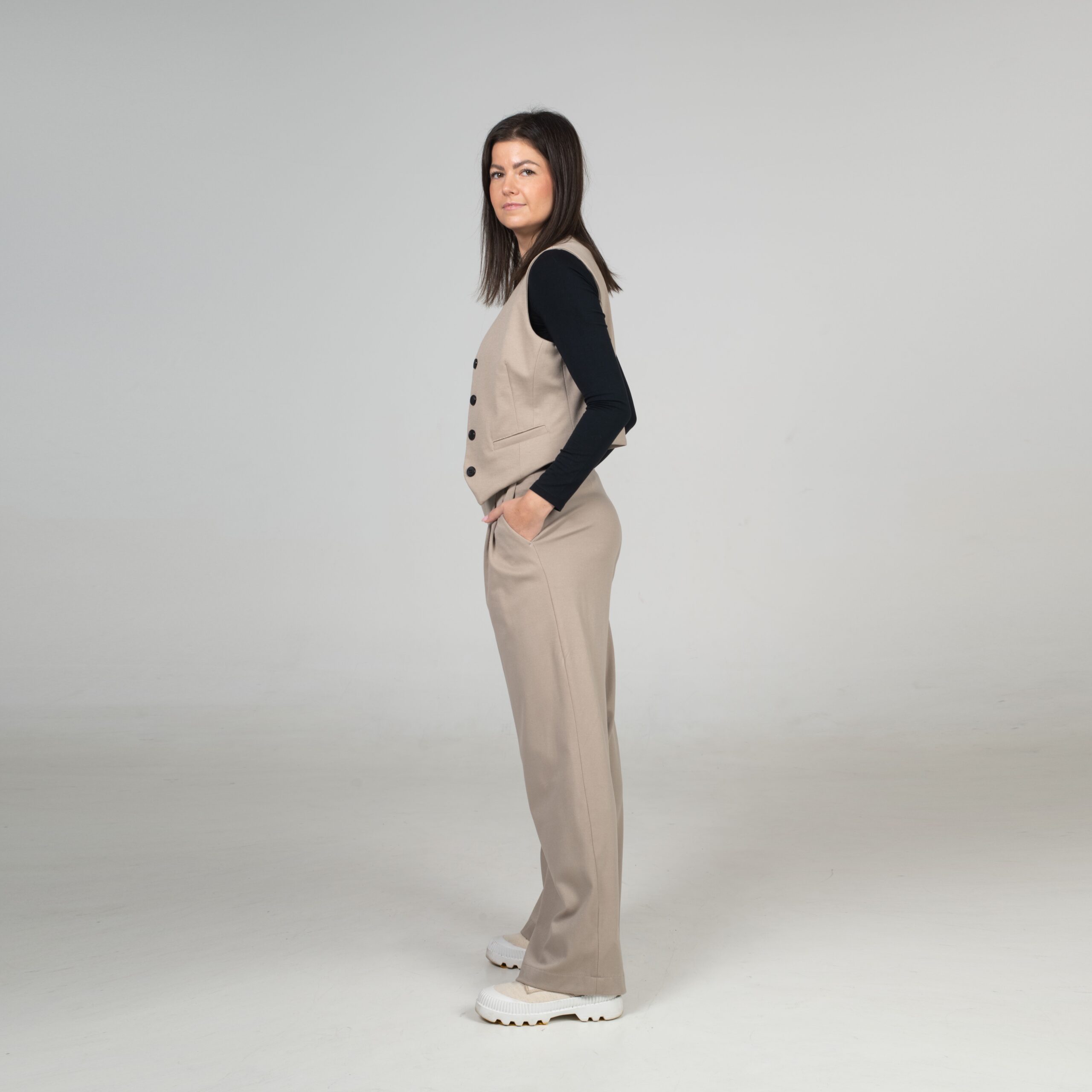 Klasická vestička, která perfektně ladí s našimi kalhotami, vytváří dohromady nadčasový komplet. Přiléhavý střih, čisté linie a precizní detaily z ní dělají kousek, který zvládne roli elegantního topu i vrstvy přes košili.