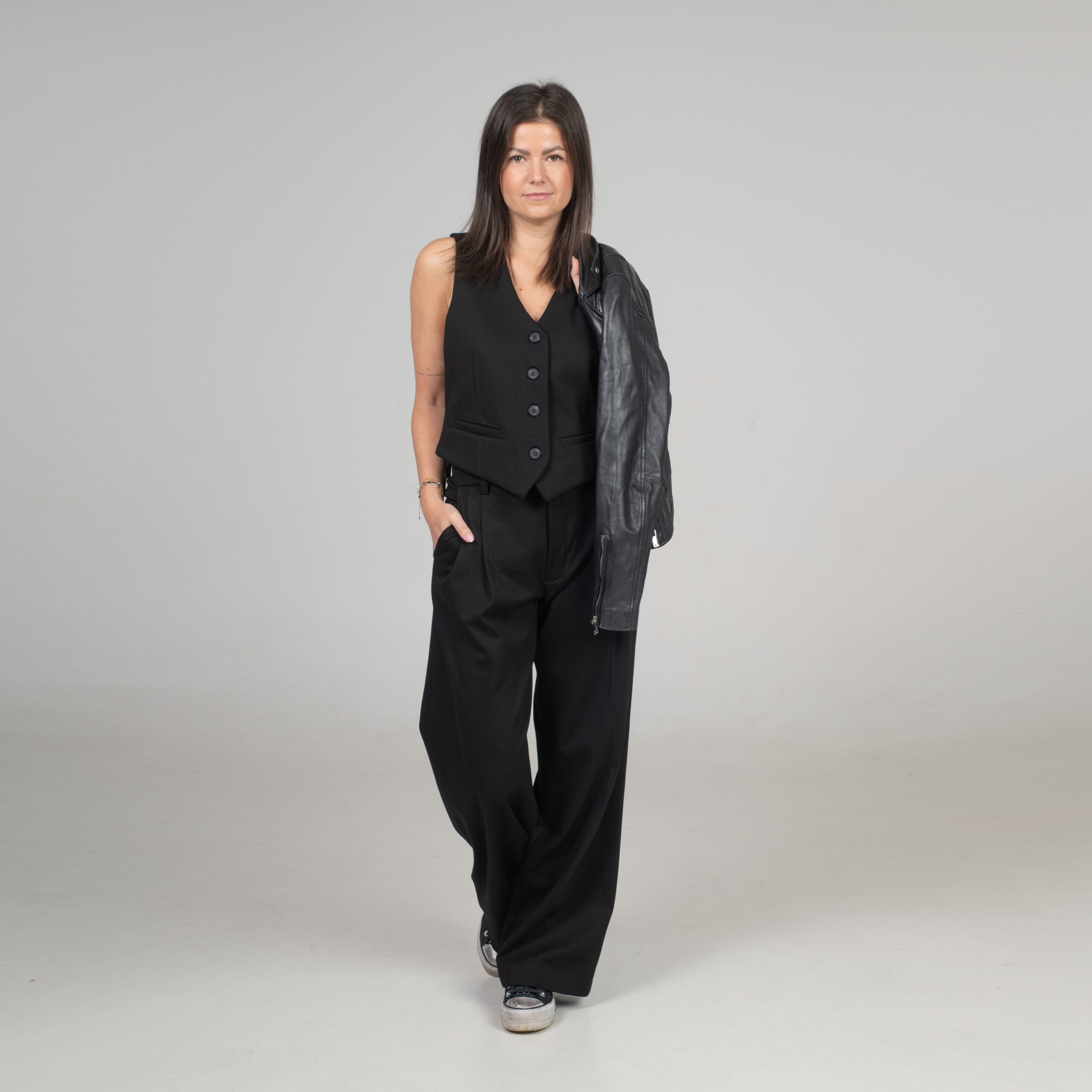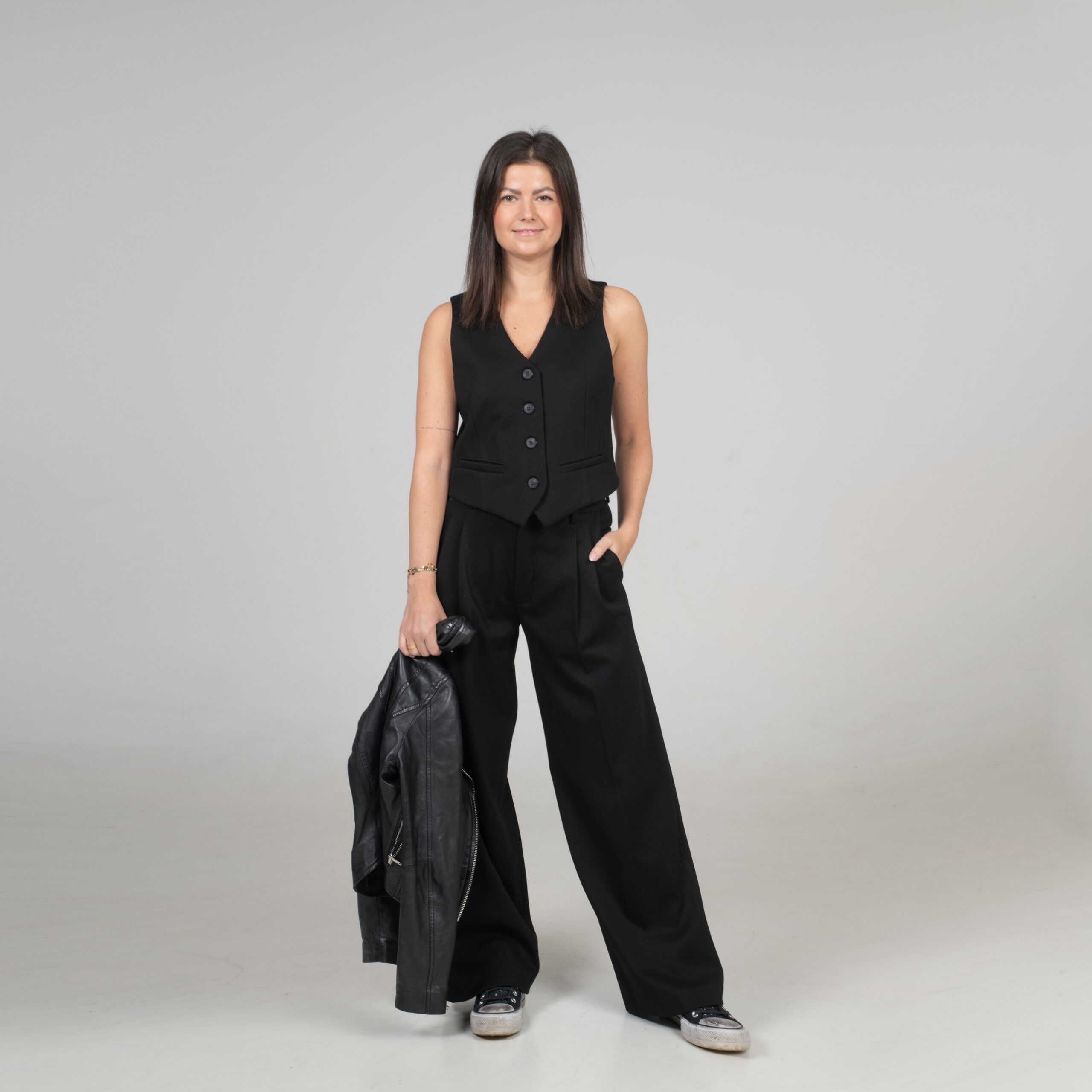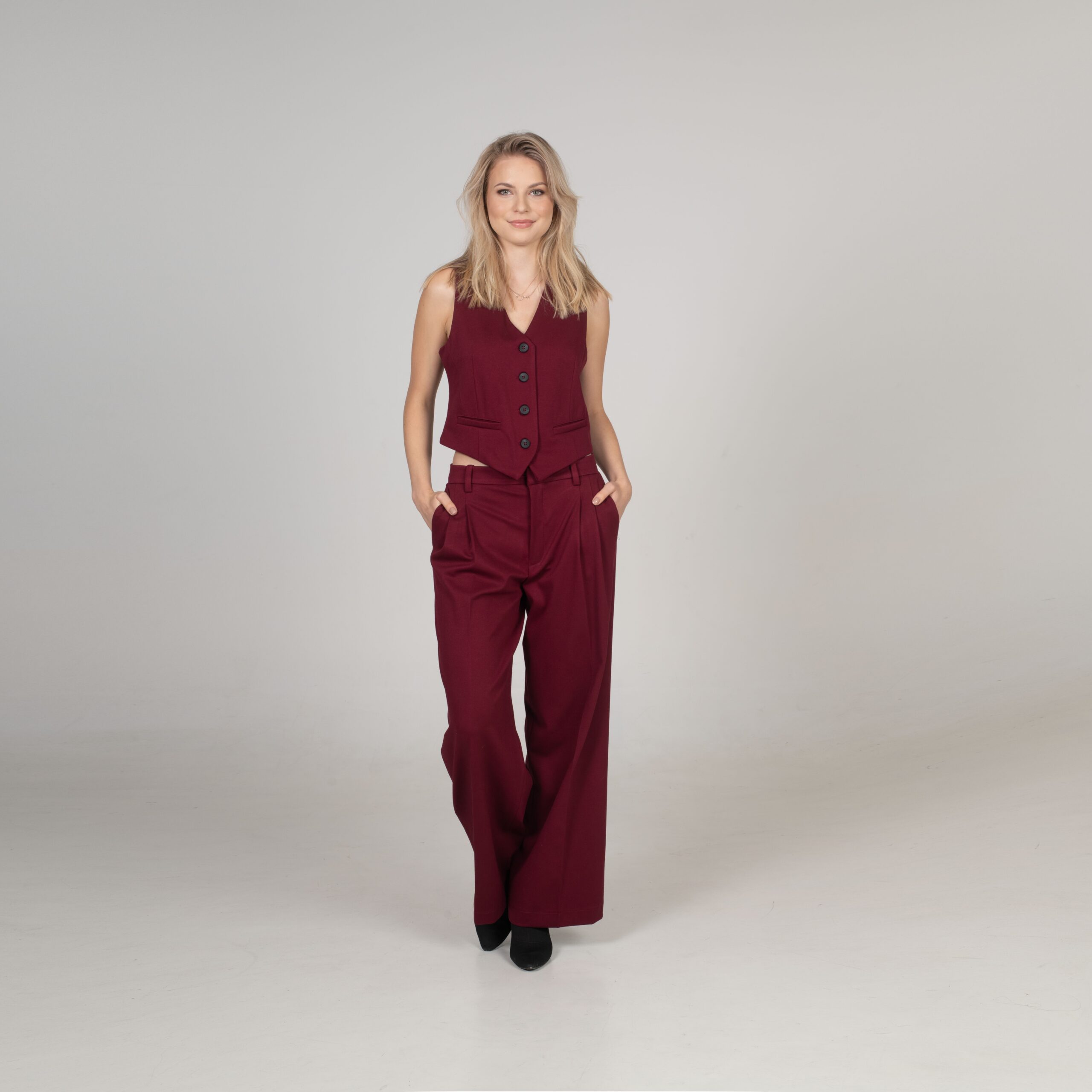 Klasická vestička, která perfektně ladí s našimi kalhotami, vytváří dohromady nadčasový komplet. Přiléhavý střih, čisté linie a precizní detaily z ní dělají kousek, který zvládne roli elegantního topu i vrstvy přes košili.